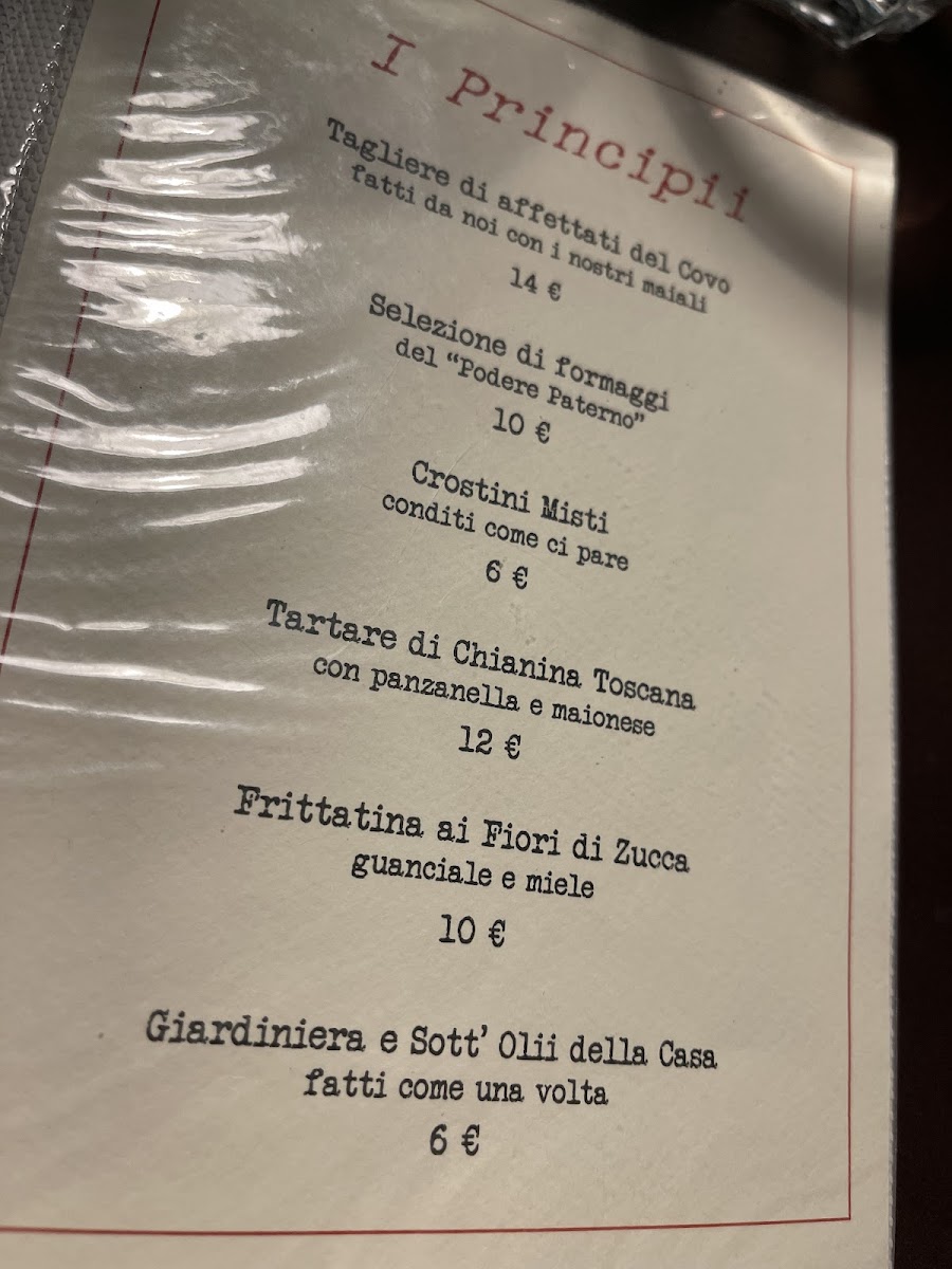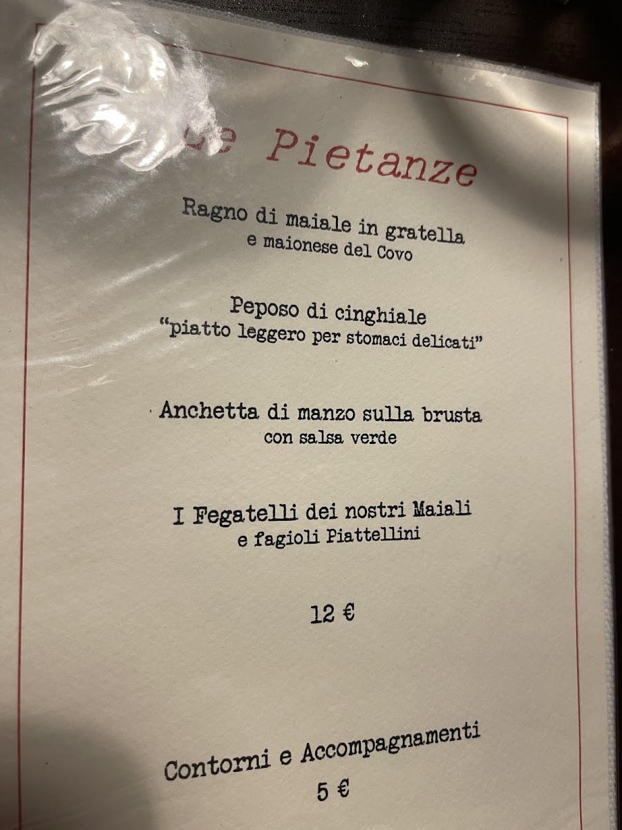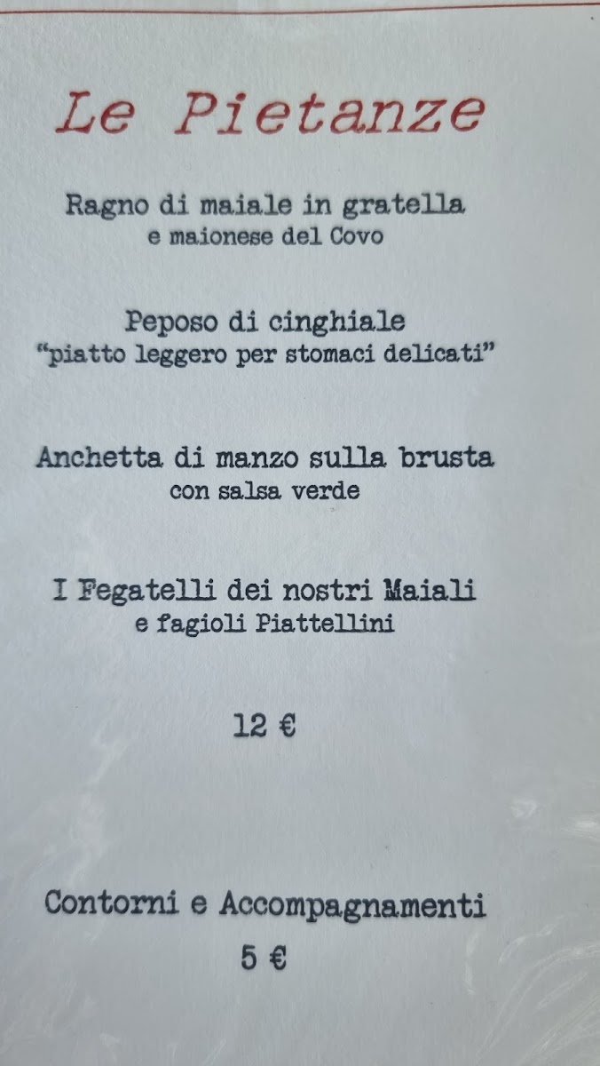 Meat lovers should not miss the Cinghiale Al Peposo, a hearty wild boar stew cooked with black pepper, while the Fegatini E Fagioli features a rich blend of chicken livers and beans, offering a unique taste of Tuscany. For a lighter bite, the Tartare Di Manzo Con Panzanella is a refreshing dish combining raw beef tartare with a traditional bread salad.